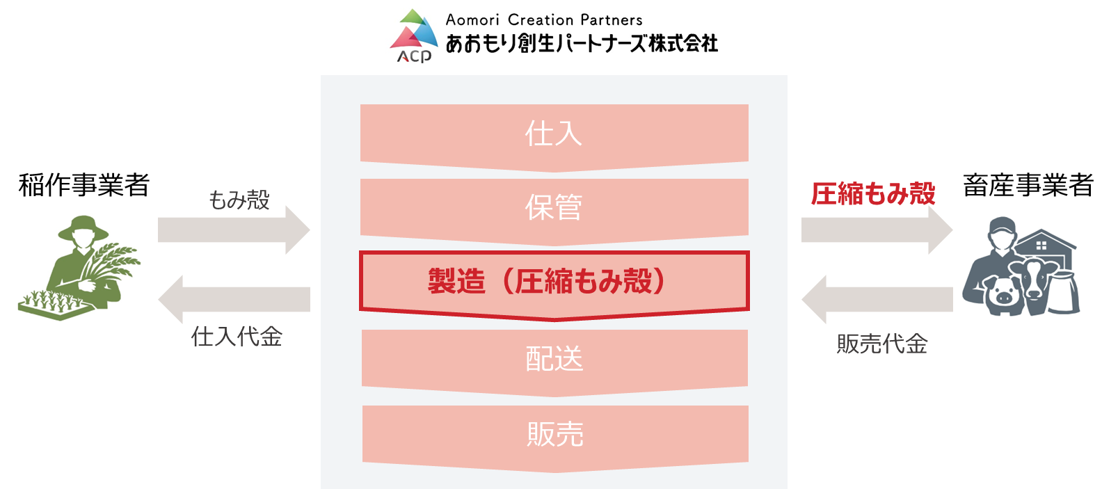 本事業は、上記の稲作事業者と畜産事業者の双方が抱える課題を解決するため、「もみ殻」を1/3に圧縮加工して津軽地域から南部地域へ流通するビジネスモデルとなります。2022年度に検討を開始して以降、事業パートナーや青森県とも連携しながら検証活動を行ってまいりました。この検証活動を通じて、稲作事業者・畜産事業者の双方から高評価をいただいたことも後押しとなり、今般の事業化判断に至りました。
