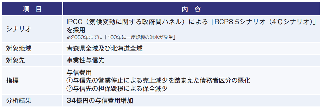 IPCC(気候変動に関する政府間バネル)4℃シナリオを基に、膏森県全域及び北海道全域にて大規模水害が発生した場合の与信先の状況等を分析し、当社グループ財務への影響を計測しました.2050年までの気温上昇を考慮した分析の結果、与信費用は34億円の増見込みとなりました。今後は与信先の売上減少店舗や担保毀損物件をハザードマップに反映させる所在地のに精緻化に努めてまいります。