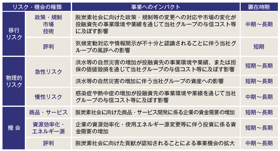 リスク・機会の分析を踏まえ、当社グループの与信コスト等に及ぽす影響をより精緻に分析するために、シナリオ分析を実施しております。今後も分析を充実させていくとともに、分析桔果を踏まえた対応について事業戦略に反映していくことで、地域社会の脱炭素化に向けた貢献を進めていきます,